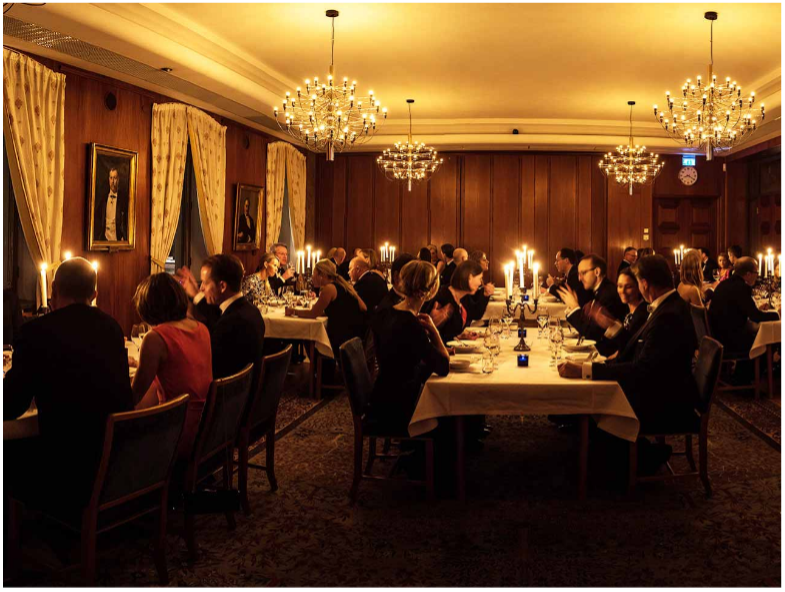Vi träffas i en mycket vacker stor sal där alla får ett glas bubbel. Det blir en kort presentation av Jernkontoret och den vackra byggnaden vi befinner oss i.
